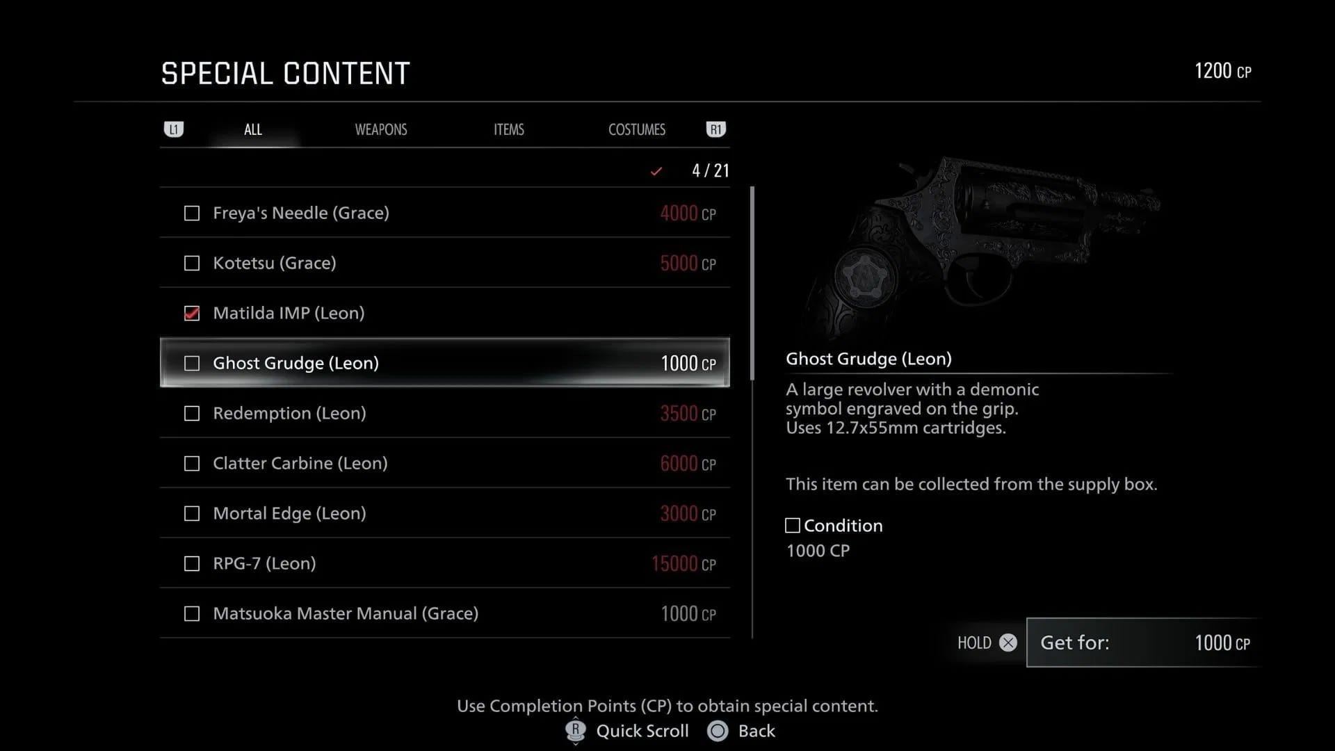 - Привид (Ghost Grudge) (1 000 CP): Важкий револьвер для Леона.
