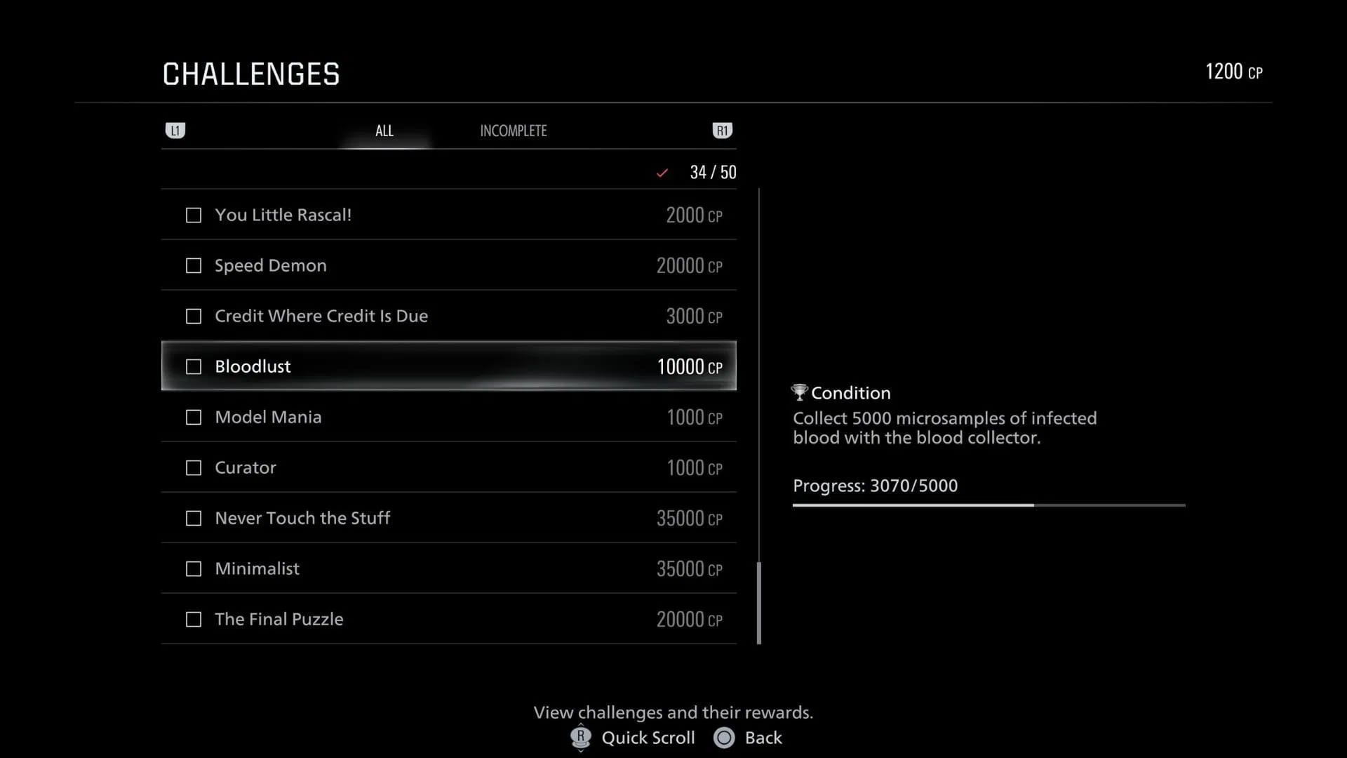 - Жага крові: Зібрати 5000 мікрозразків зараженої крові — 10 000 CP.