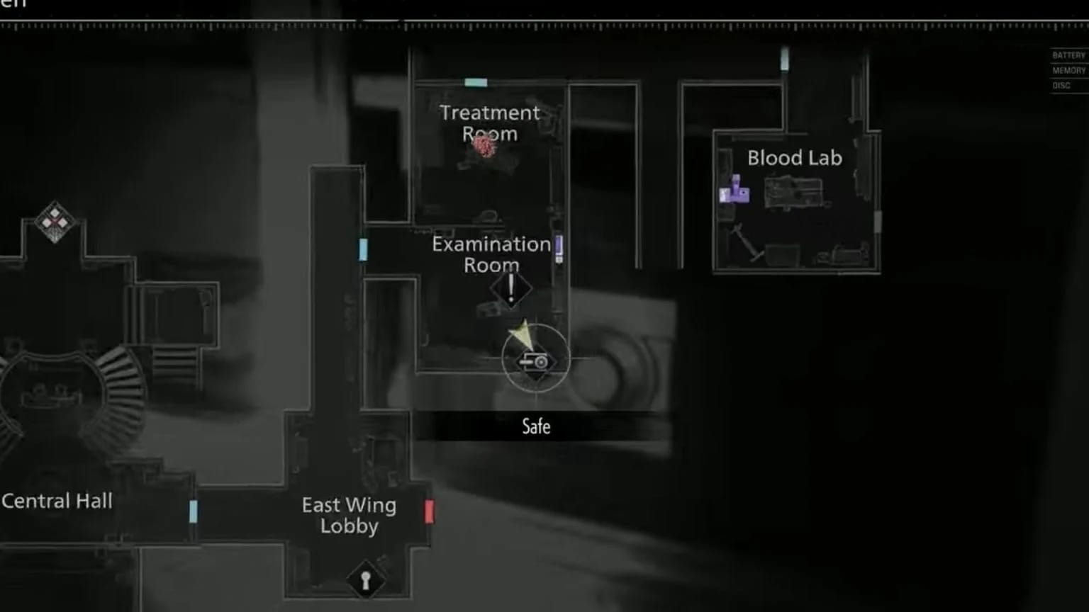 Оглядова кімната (Examination Room) розташована на першому поверсі Східного крила (1F, East Wing).